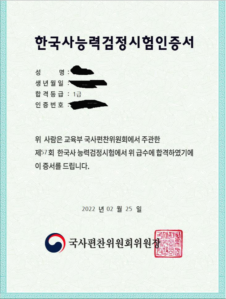 저번에 한능검 시험을 쳐서 1급을 취득했다.