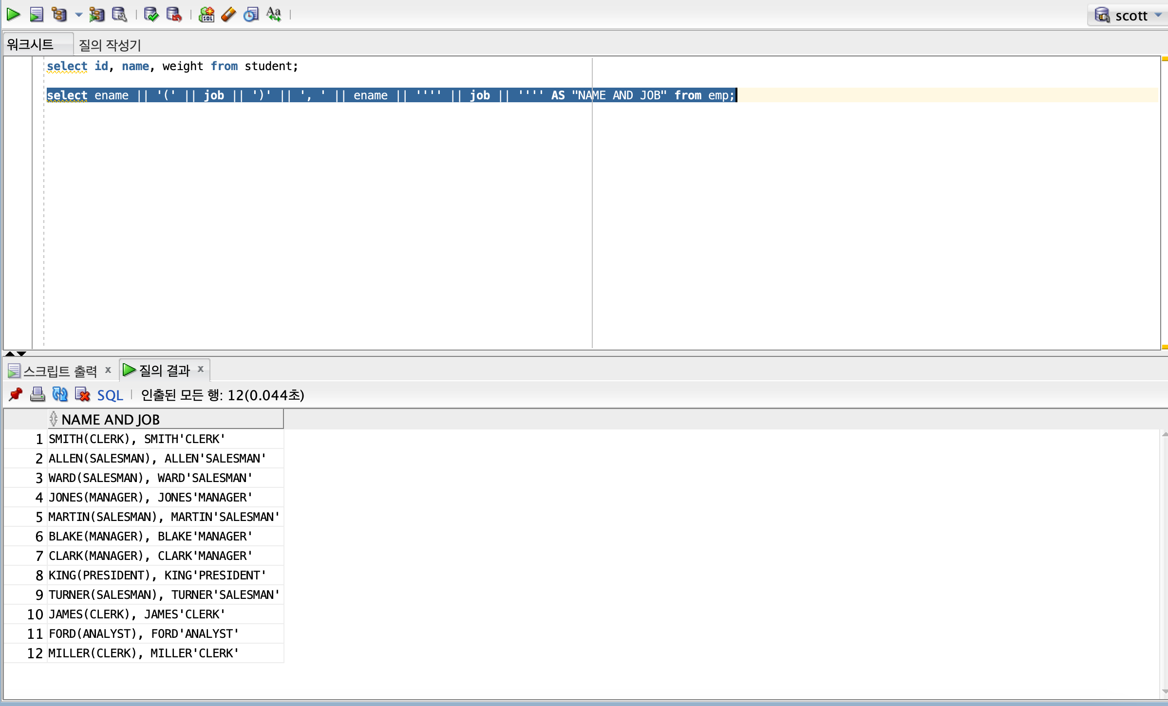 select ename || '(' || job || ')' || ', ' || ename || '''' || job || '''' AS "NAME AND JOB" from emp;