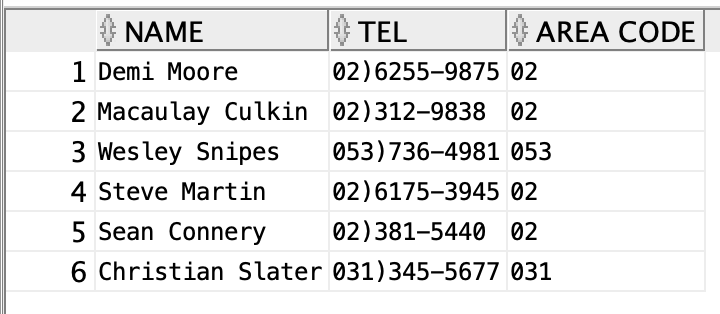 select initcap(name) name, tel tel, substr(tel, 1, instr(tel, ')') -1) "AREA CODE"