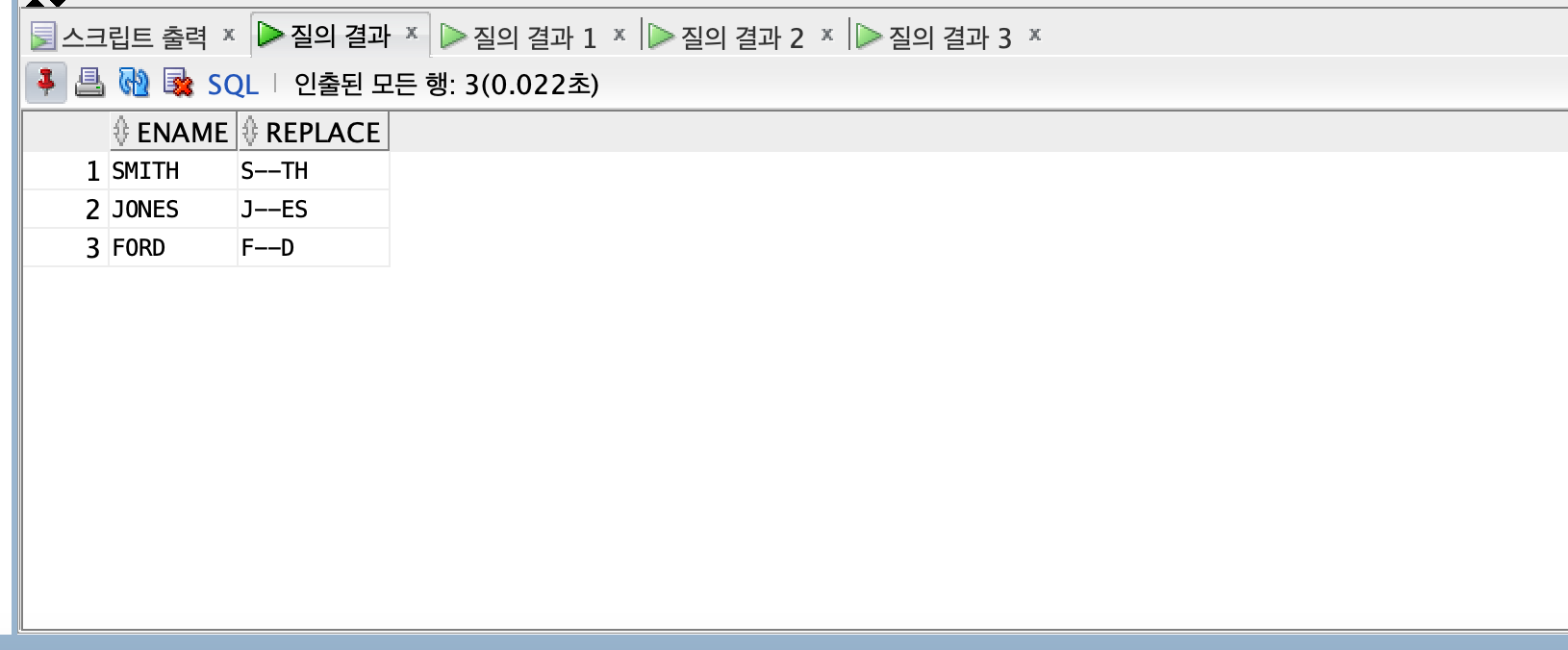 SELECT ENAME, REPLACE(ENAME, SUBSTR(ENAME, 2, 2), '--') "REPLACE"