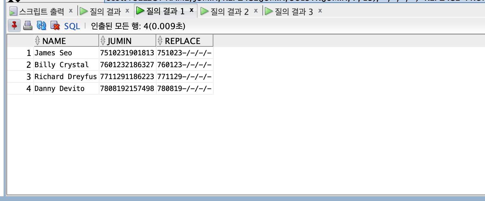 SELECT NAME, JUMIN, REPLACE(JUMIN, SUBSTR(JUMIN, 7, 13), '-/-/-/-') "REPLACE"