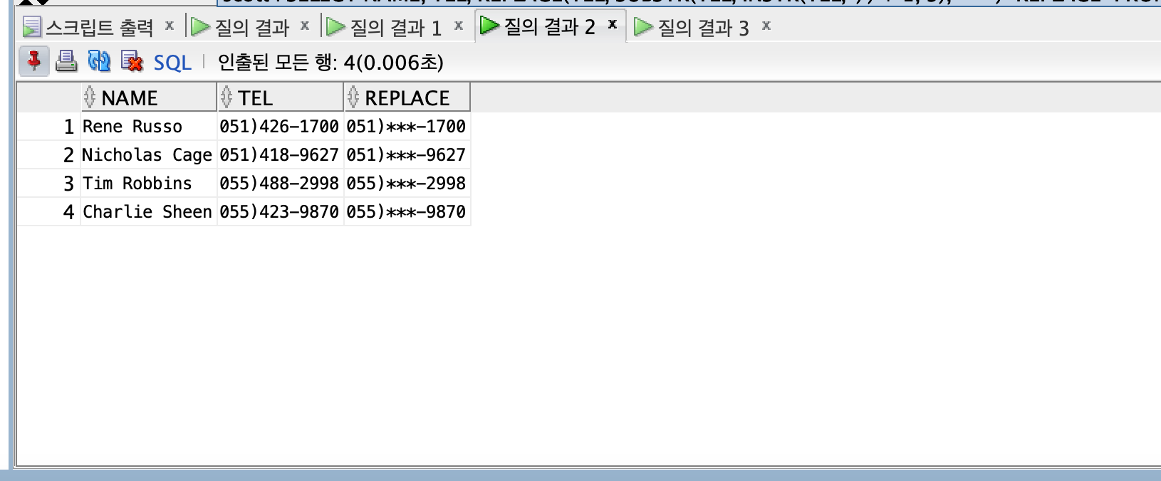 SELECT NAME, TEL, REPLACE(TEL, SUBSTR(TEL, INSTR(TEL, ')') + 1, 3), '***') "REPLACE"