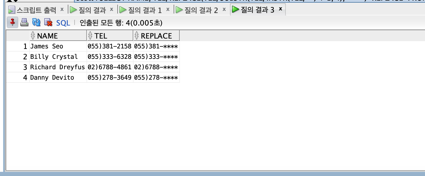 SELECT NAME, TEL, REPLACE(TEL, SUBSTR(TEL, INSTR(TEL, '-') + 1, 4), '****') "REPLACE"