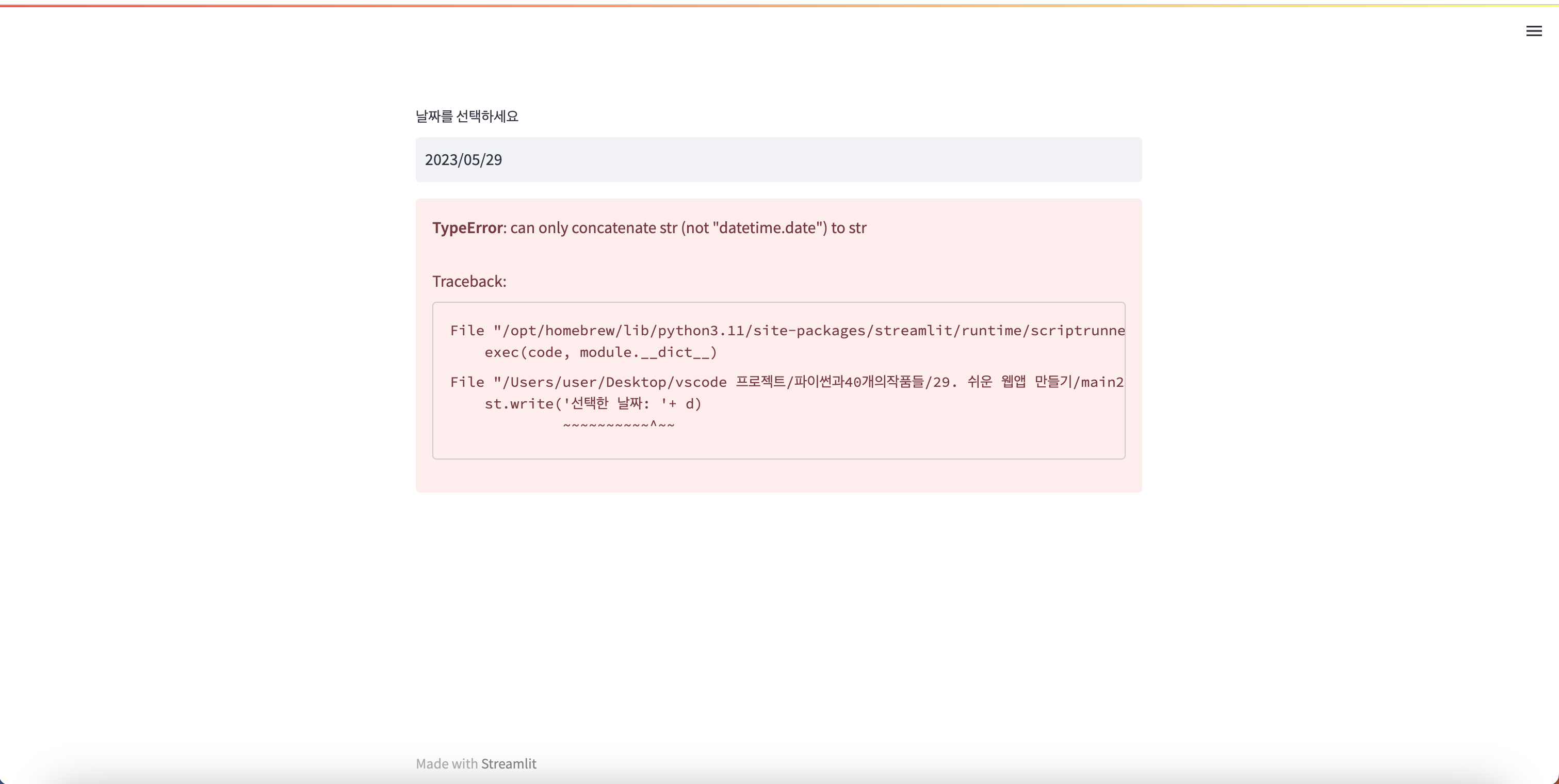 출력 화면에 보이는 오류 문구를 보면 st.write() 인자 값을 부여할 때 오류가 생겼다.