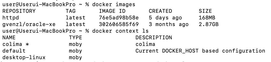 docker context ls로 확인한 결과 현재의 context는 colima이고 colima context 내부의 images가 위의 오라클 이미지라는 걸 알 수 있다.