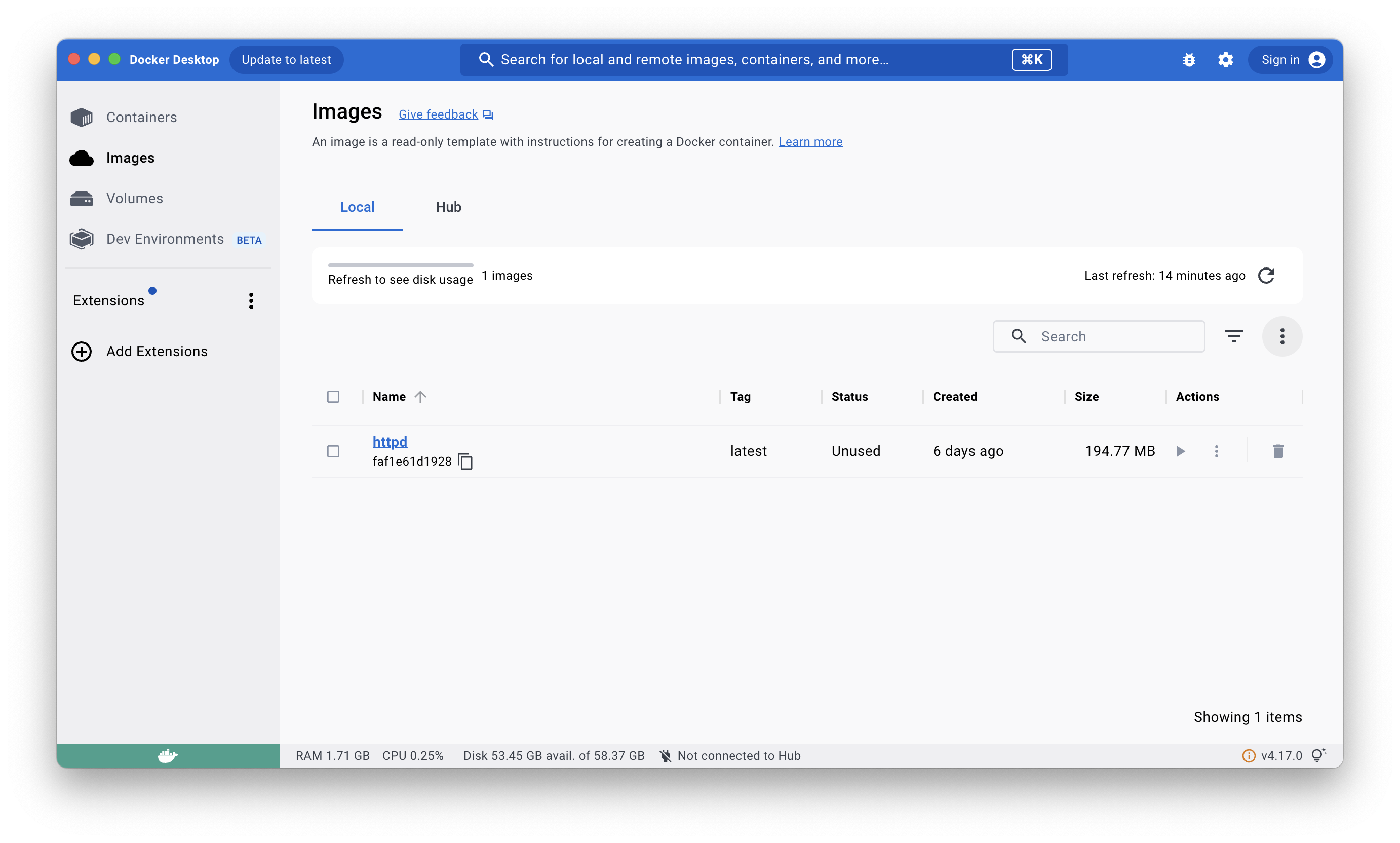 설치가 완료되면 도커 데스크톱 앱에 이미지가 설치된 것이 보인다.