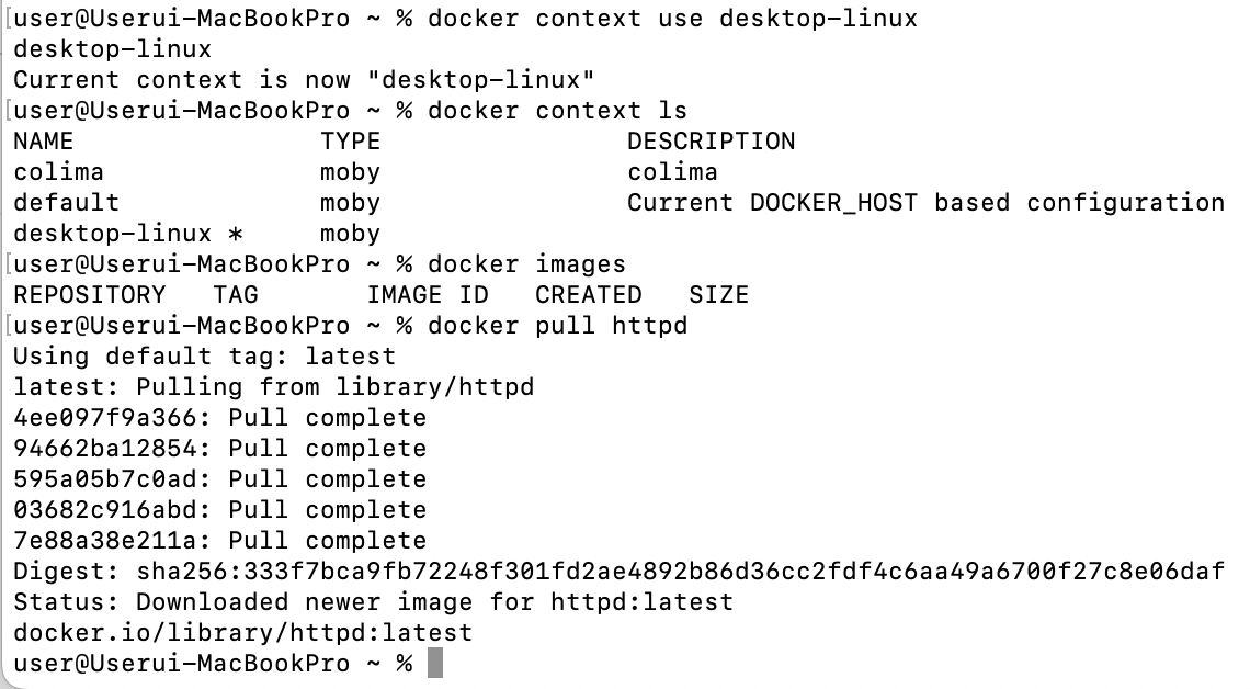 docker context use desktop-linux 명령어로 현재 context를 colima에서 desktop-linux로 교체했다.