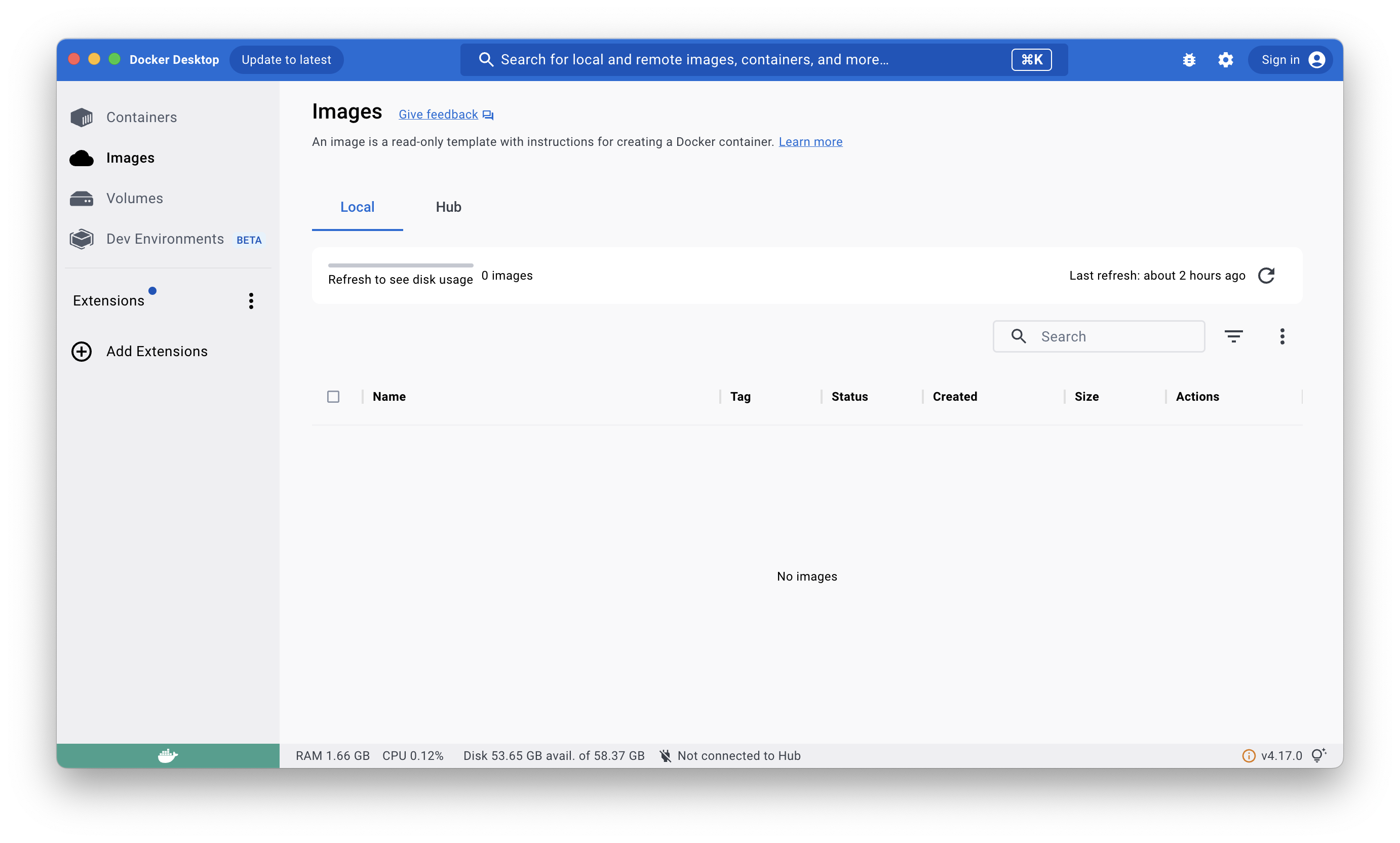 명령어 실행 후 docker images 명령어로 이미지를 조회해도 조회되는 이미지가 없다.