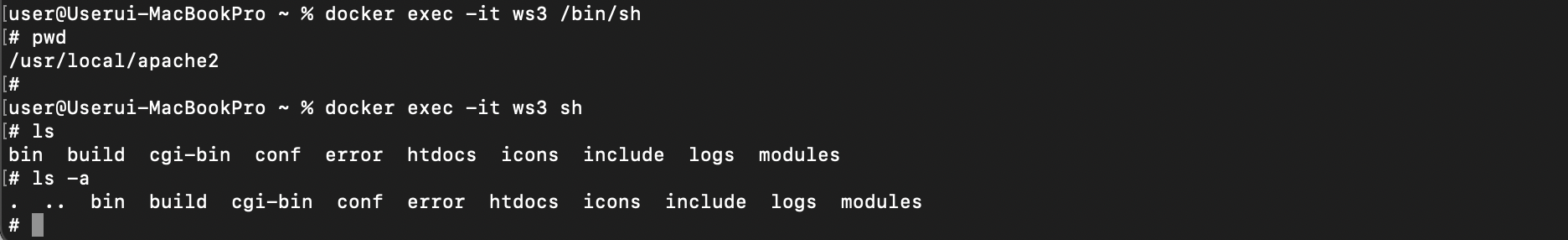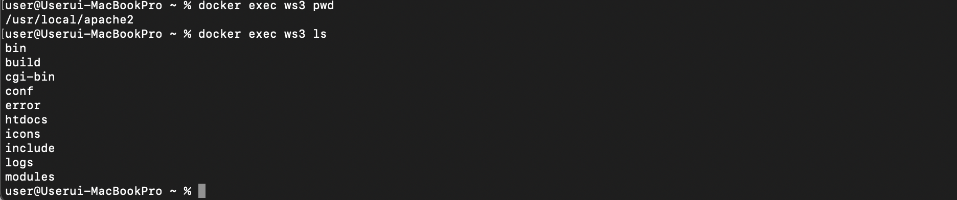 docker exec ws3(컨테이너명) pwd(명령어, 현재 경로 출력)