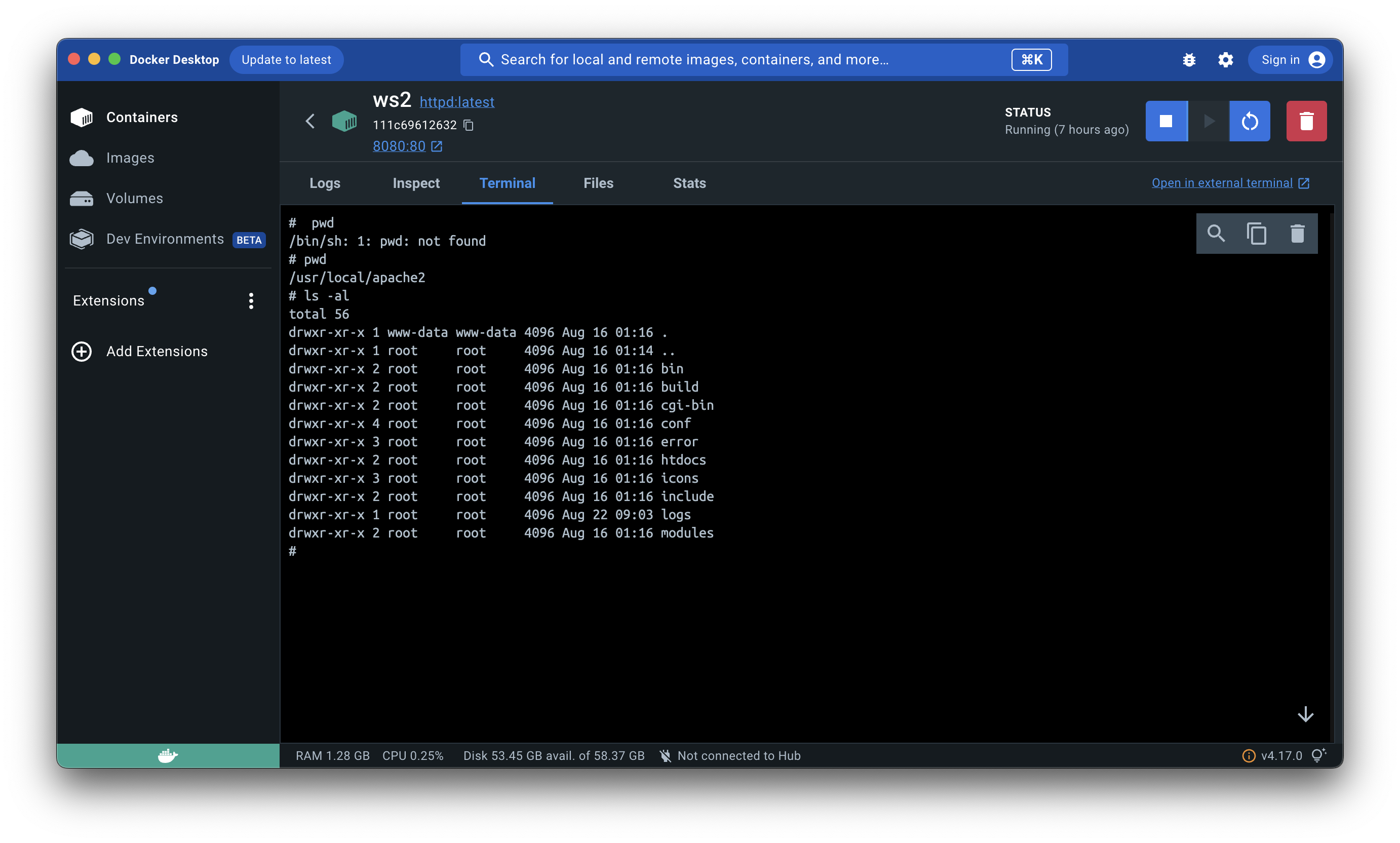 내가 선택한 컨테이너에서 터미널을 열어 터미널에 대해 명령어를 실행시킬 수 있다.