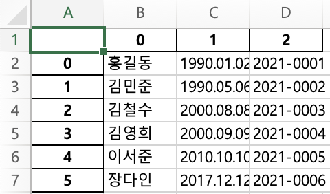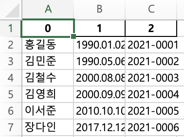 이런식으로 엑셀파일의 행에 인덱스가 추가된 것을 확인할 수 있다.
