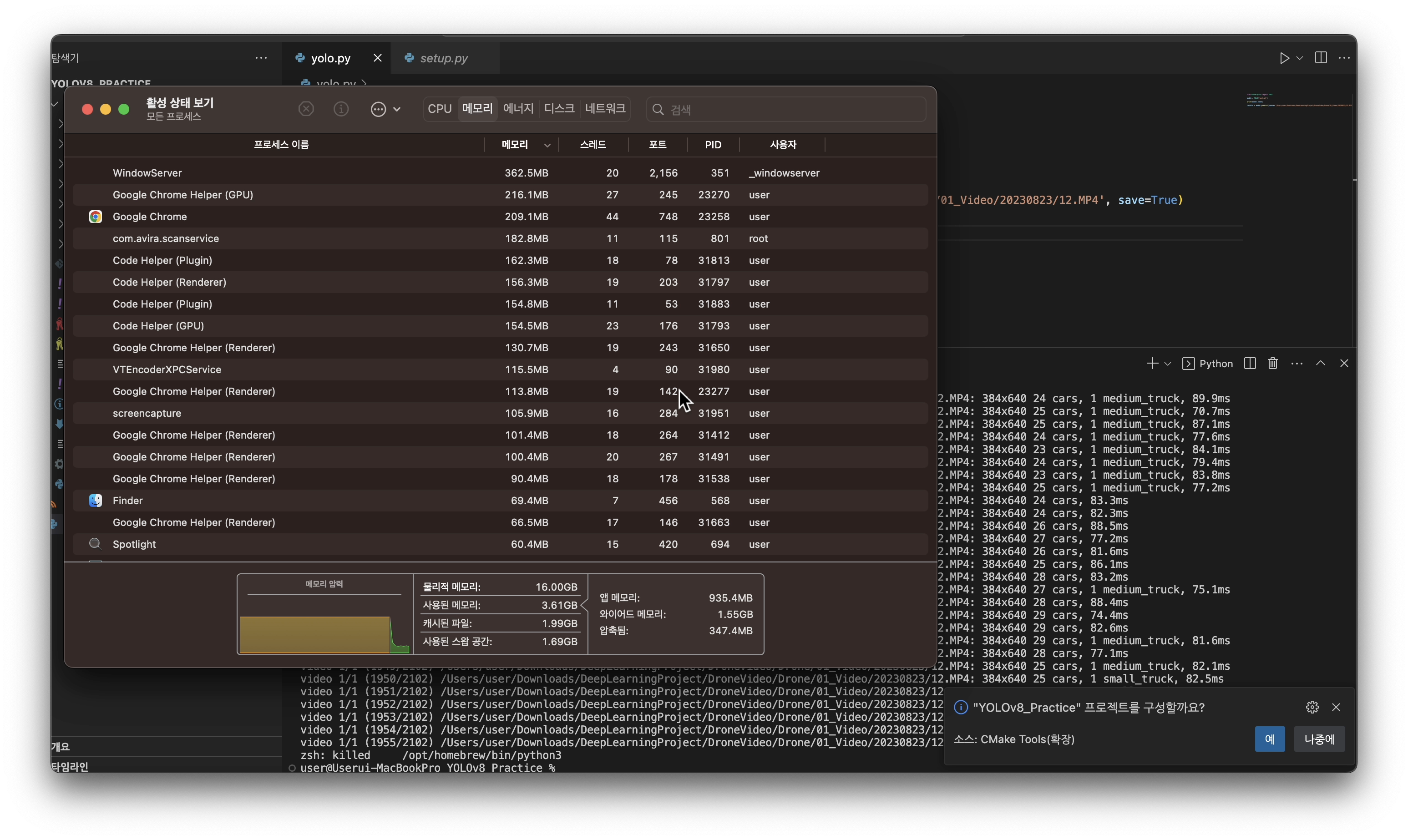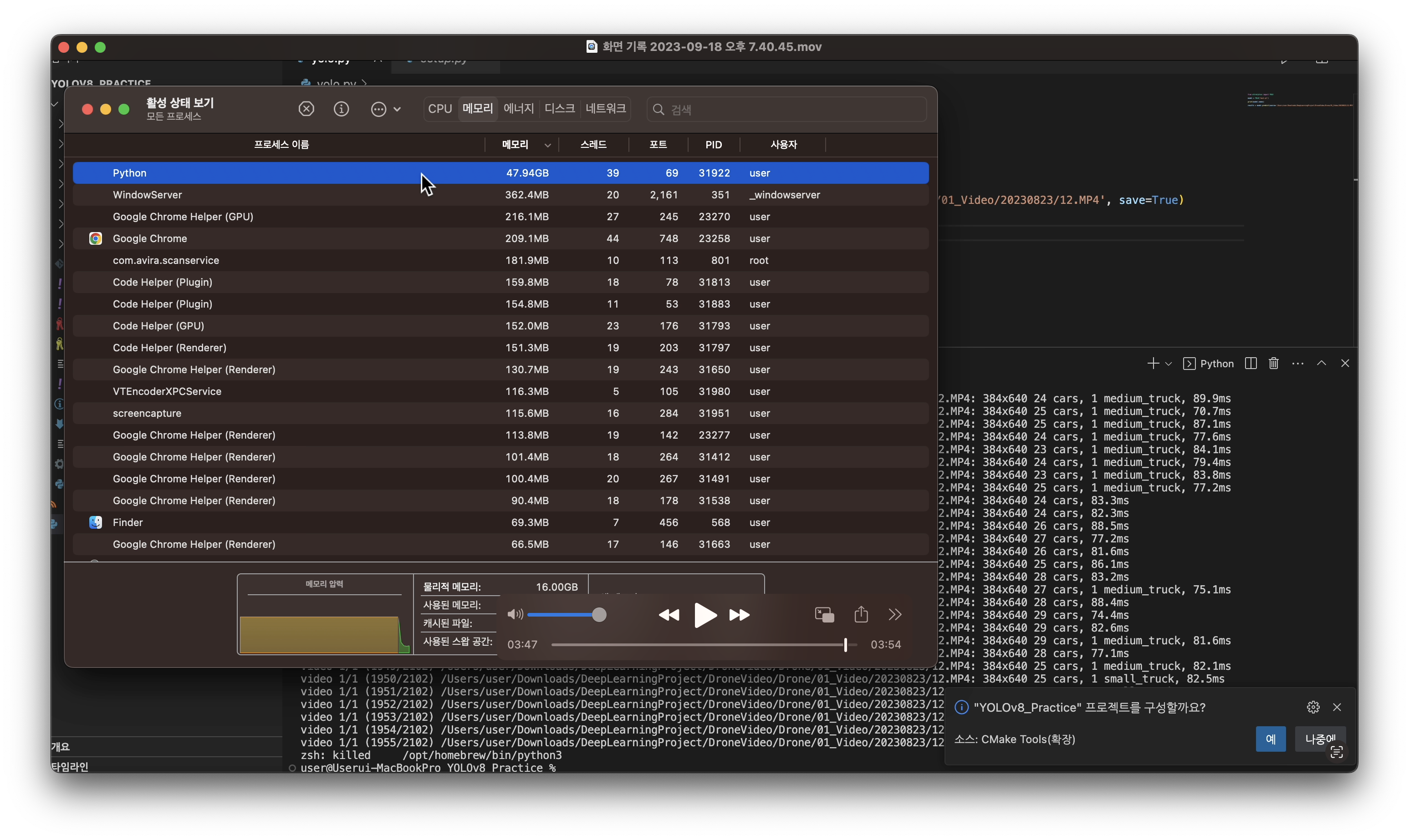 yolov8의 모델로 비디오 객체탐지 시 위와 같이 실행 중 프로세스가 죽어버리는 오류가 지속적으로 발생한다. https://stackoverflow.com/questions/66295155/zsh-killed-python3-on-m1-macbook-pro zsh: killed python3 on M1 MacB