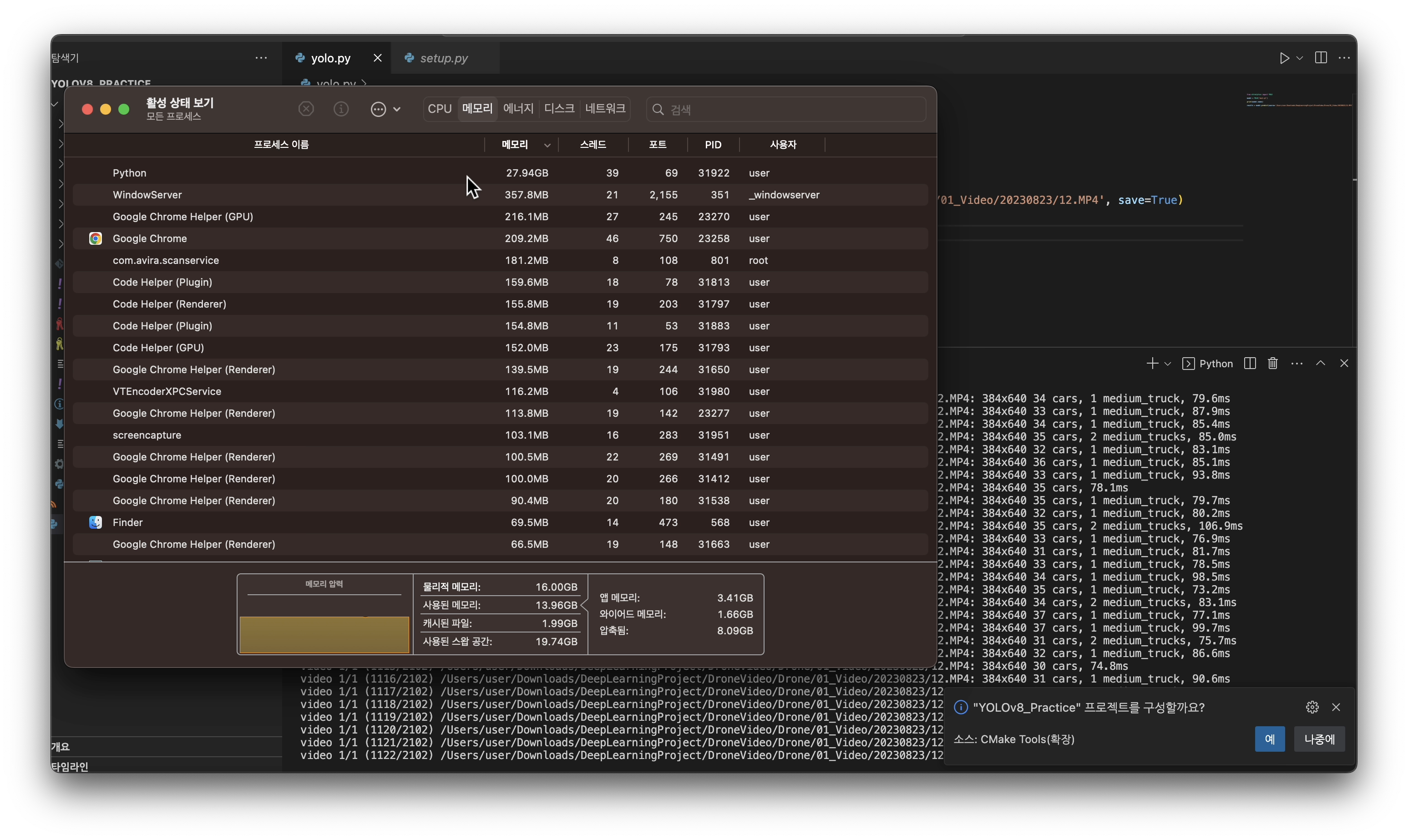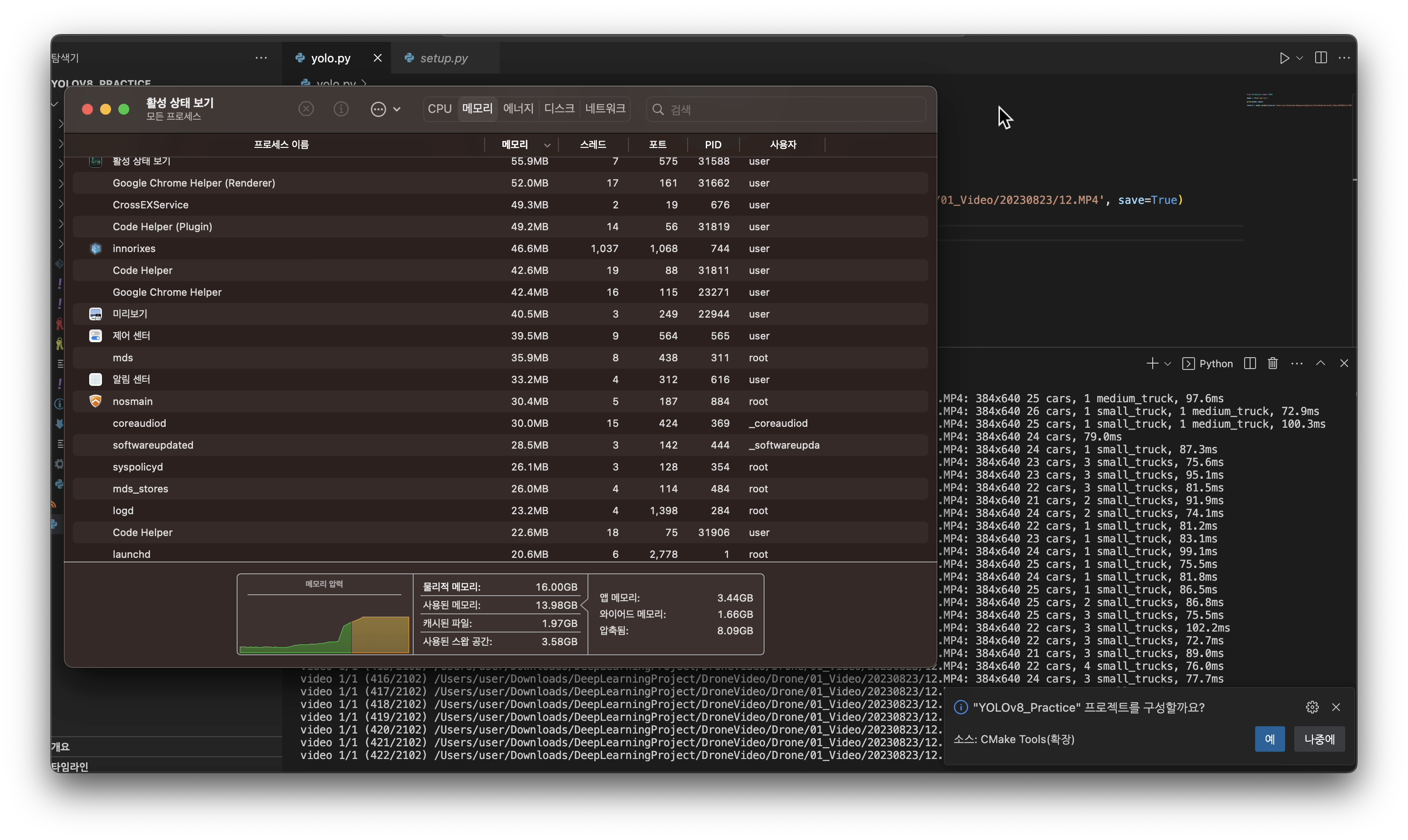 위 사진들에서 메모리 사용량을 보면 yolov8 객체탐지 과정에서 메모리 소모량이 매우 극심하다.