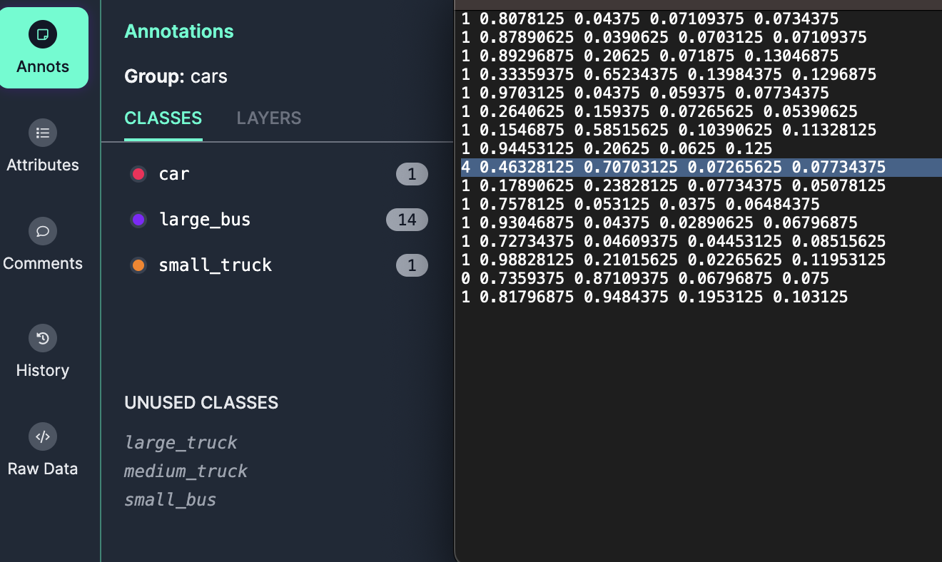 위 사진을 보면 car 클래스의 인덱스는 0, large bus 클래스의 인덱스는 1, small truck 클래스의 인덱스는 4이다.