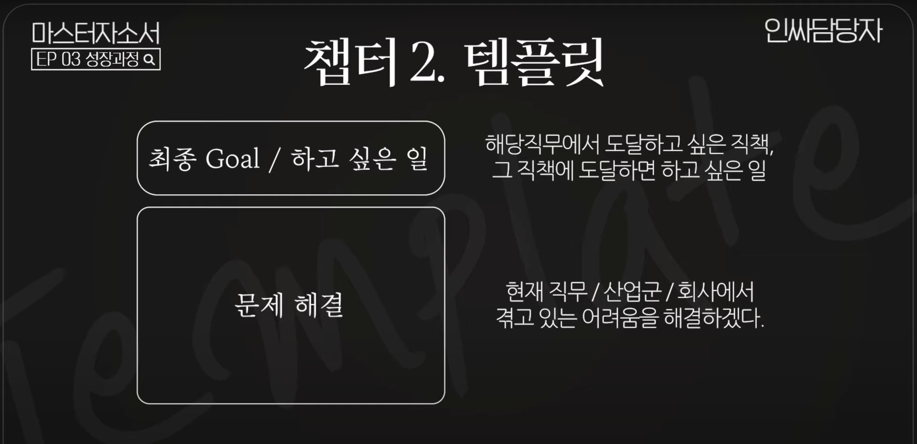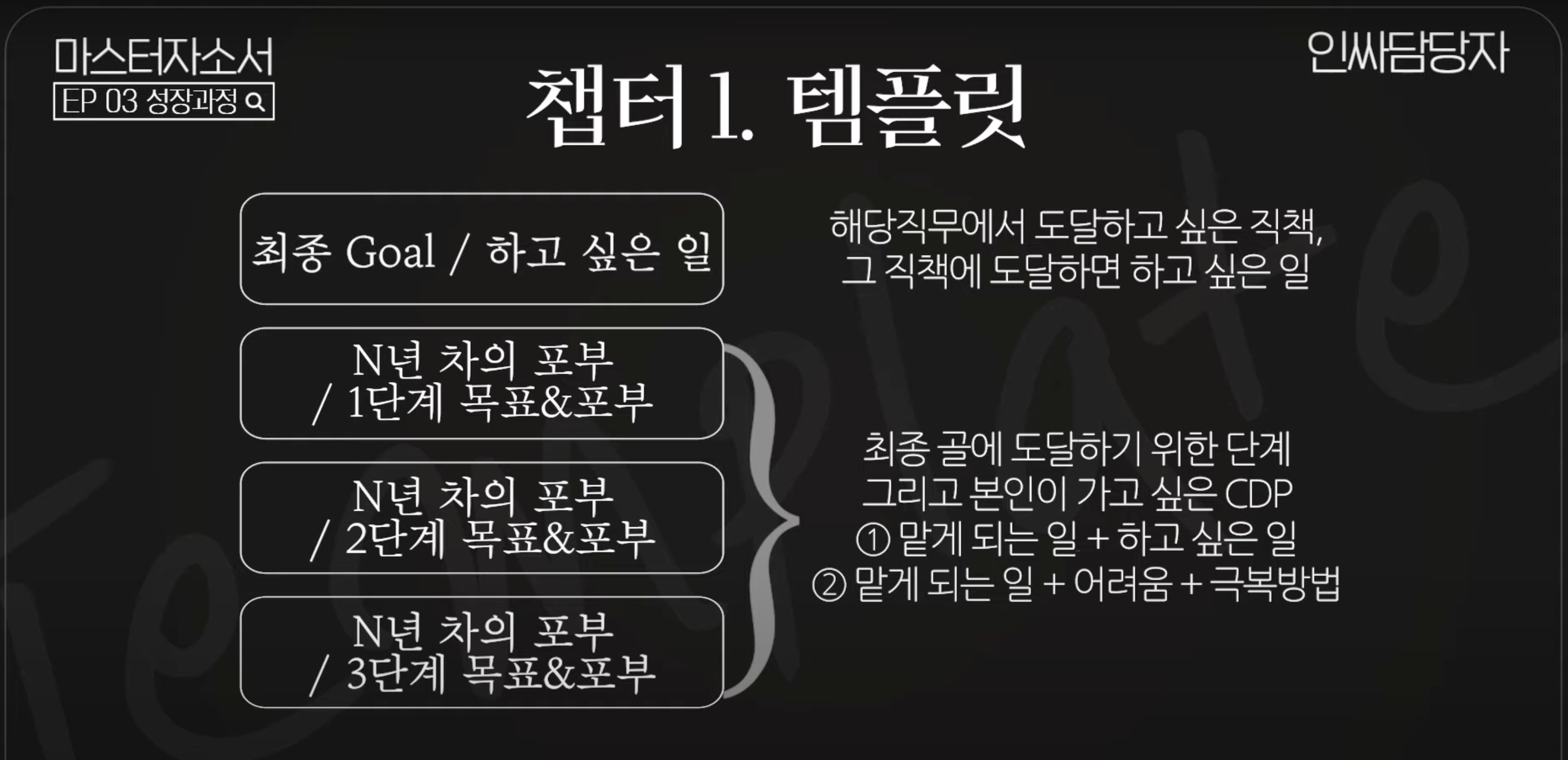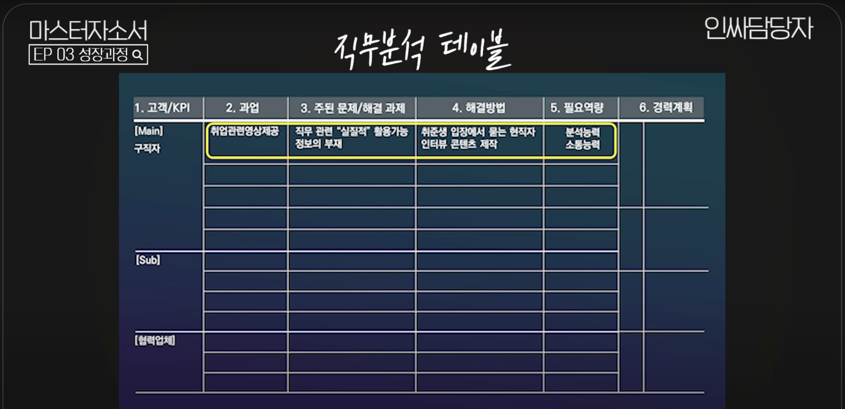 그리고 직장인은 연차마다 하는 일이 달라지는데 이 부분도 직무 분석 테이블의 경력계획 파트에서 가져오면 된다.