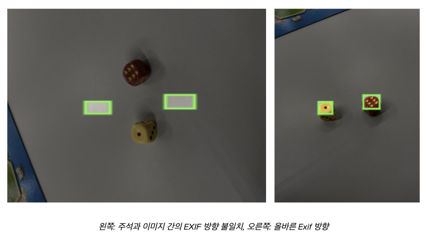 하지만 간혹 프로그램이 해당 메타데이터를 읽어들이지 못하고 이미지 방향이 틀리게 지정되면 클래스를 지정한 바운딩 박스와 이미지의 객체가 어긋나는 현상이 발생한다.