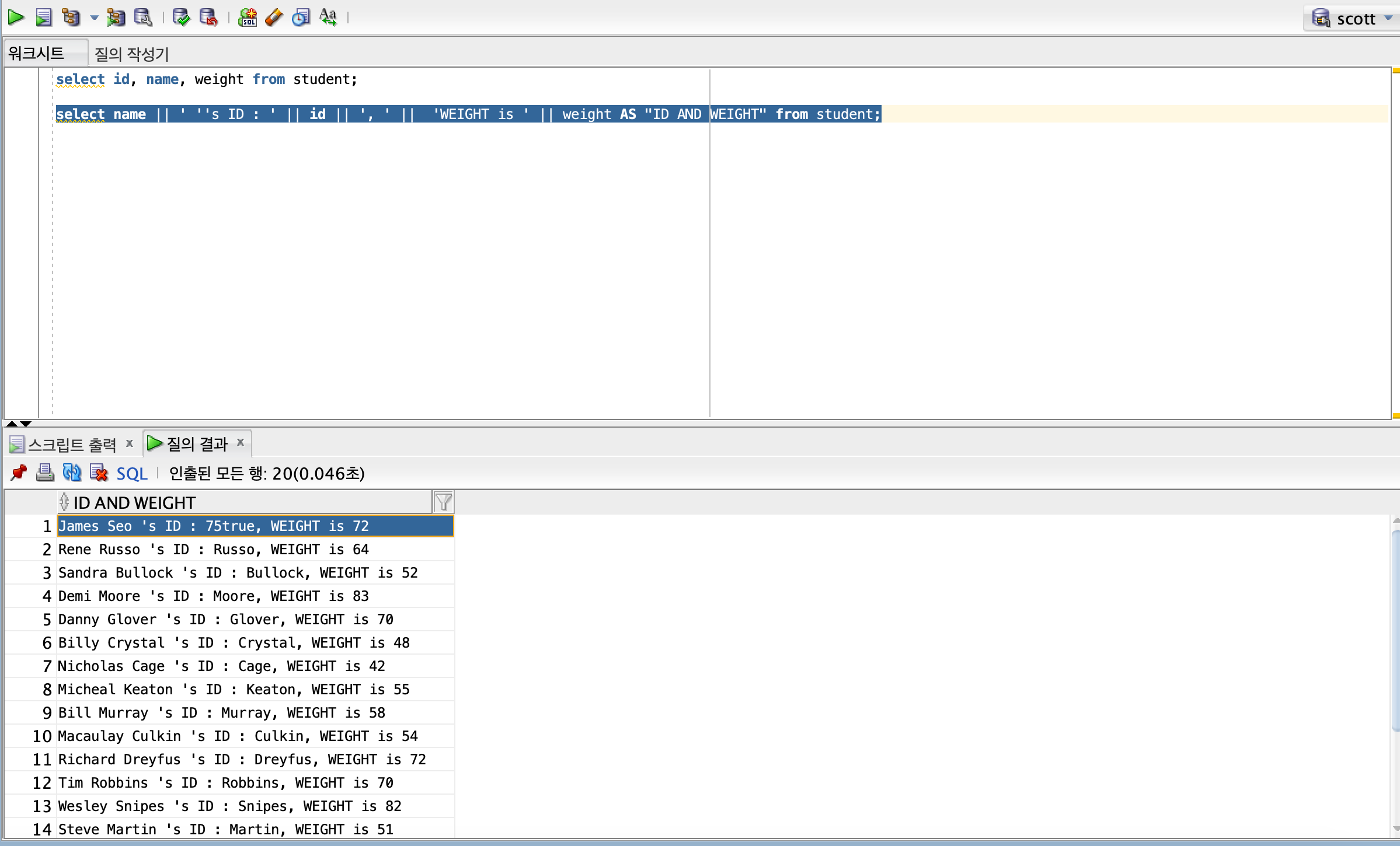 select name || ' ''s ID : ' || id || ', ' || 'WEIGHT is ' || weight AS "ID AND WEIGHT" from student;