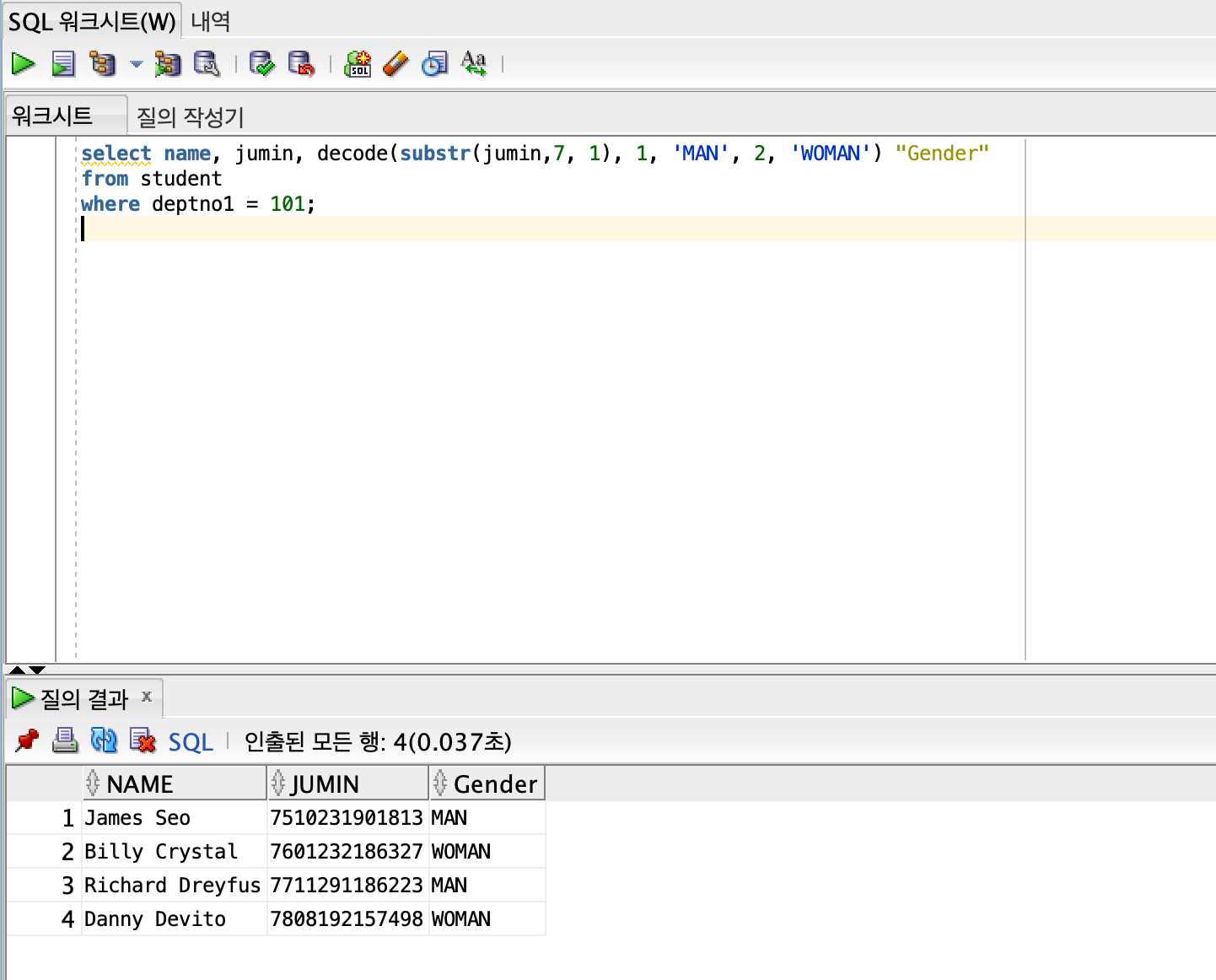 select name, jumin, decode(substr(jumin,7, 1), 1, 'MAN', 2, 'WOMAN') "Gender"
