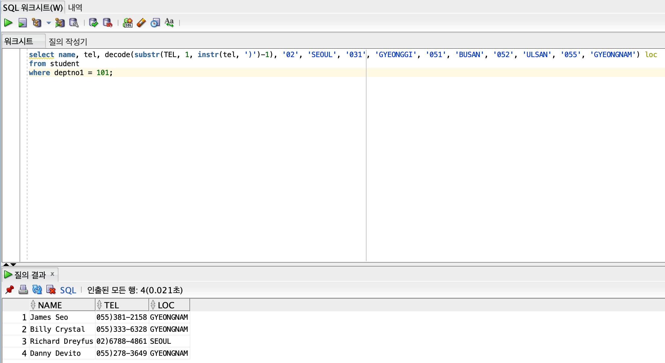 select name, tel, decode(substr(TEL, 1, instr(tel, ')')-1), '02', 'SEOUL', '031', 'GYEONGGI', '051', 'BUSAN', '052', 'ULSAN', '055', 'GYEONGNAM') loc
